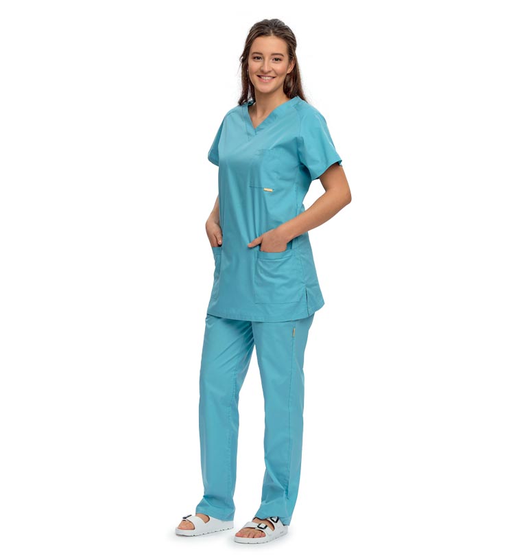 Die Hosen verfügen in der Taille über einen Kordelzug. Die Oberteile – Kimono-Tunika – sind passgenau geschnitten. Beide Teile, die Hose und auch die Tunika haben mehrere praktische Taschen. Das Material ist atmungsaktiv und pflegeleicht.